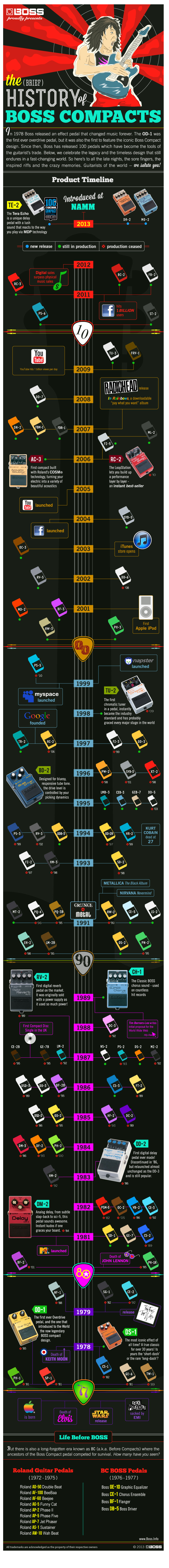 아래 포스터는 BOSS 이전 Roland 브랜드로 발매한 이펙터부터 시작하여 1978년 BOSS 브랜드로 최초의 컴팩트 이펙트 페달 3종(OD-1, PH-1, SP-1)을 발매한 후 2013년까지 발매한 모든 BOSS의 이펙트 페달이 수록되어 있다.