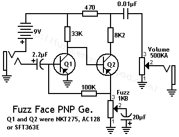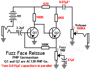 Aron의 Stompbox 포럼의 누군가는 Silicon Fuzz Face 클론에서 트랜지스터의 Collector-Base 사이에 100pF 커패시터를 연결하면 게인과 발진을 제어하는데 도움이 될 것이라고 말했습니다.