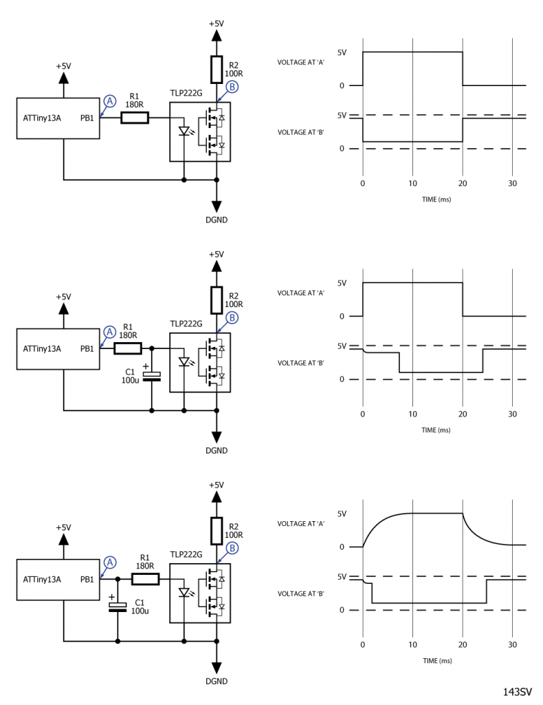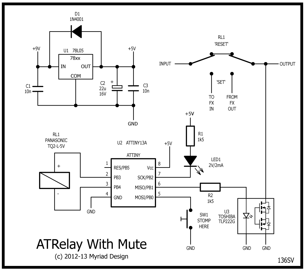 Note that if you want to muck about with the soft mute, I have left a 20 ms delay before operating the relay. R2 will need to be in the region of 3.6k – 5.6k. You might consider a 1.5k resistor with a 5k preset in series. As previously noted, U1 could be LP2950-5V to save battery life; U2 could be ATtiny13 in lieu of ATtiny13A; and finally, U3 could be TLP222A. R1 may need to be reduced if your LED is too dim. Here’s a link to firmware hex file with timings as per figure 142SV above. No fuse changes required. TLP222G’s are available for sale in the Stompville Shop.