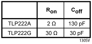 Note that Coff is comparable with the TLP222G, but Ron is much higher. Clearly, we would want to choose the ‘F1 variant over the ‘F3 variant.